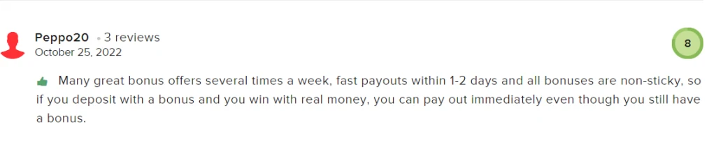 Pozitīvo atsauksmju kopsaucējs noteikti ir plašais kazino spēļu piedāvājums, kā arī dāsnie bonusi un akcijas. Tāpat atzinību ir guvusi kazino mājaslapa, kas, pēc spēlētāju domām, ar savu krāšņumu iedrošina un vilina spēlēt populārākas spēles. Kā negatīvo aspektu daži lietotāji min ilgo izmaksu laiku un skopas klientu atbalsta centra atbildes.