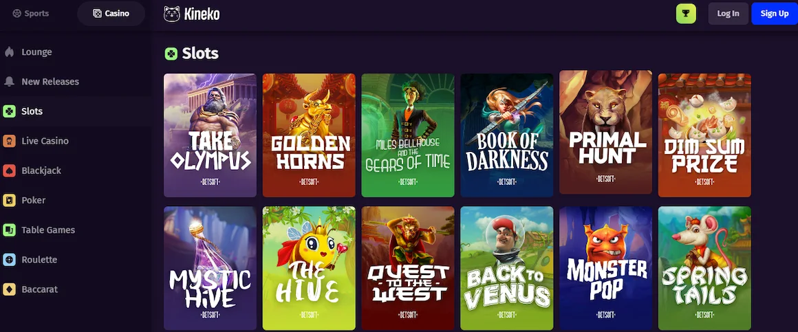 Kineko Casino piedāvā aptuveni 300 spēļu automātus, un 100+ kazino spēles. Tā nav milzīga kolekcija, taču tā ir labi izveidota un pārskatāma. Katrs spēles nosaukums ir labi noformēts un glīti sakārtots, tāpēc tas piedāvā patīkamu azartspēļu pieredzi. Starp citu mazāka spēļu kolekcija var būt arī ieguvums, piemēram, kad vēlaties spēlēt, atrodoties ceļā, un Jums nav tik daudz laika, lai ritinātu bezgalīgu spēļu sarakstu.