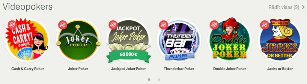 Pafbet kazino video pokera klāsts ir ievērojami plašāks nekā citos kazinos. Pieejami veseli 9 veidi: Cash&Carry Poker, Joker Poker, Jackpot Joker Poker, Thunderbar Poker, Double Joker Poker, Jacks or Better, Jacks or Better Mh, Deuces Wild Mh un 4 of a Kind Poker.
