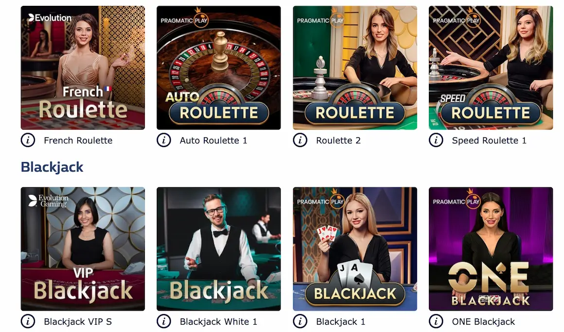 - Blackjack – Blackjack VIP S, Blackjack White 1, Blackjack 1, ONE Blackjack.