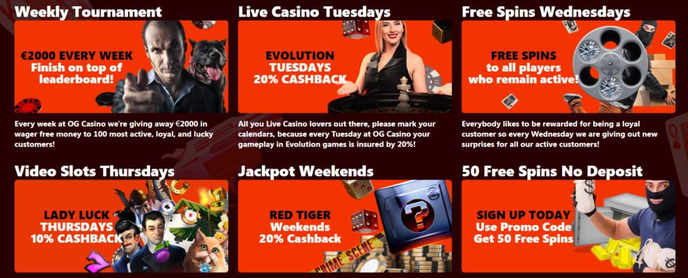 После того, как игроки используют свой приветственный бонус, OG Casino предлагает ознакомиться с дальнейшими акциями и турнирами в разделе “Предложения”. Здесь игрокам представлены дальнейшие варианты видов доступных бонусов: