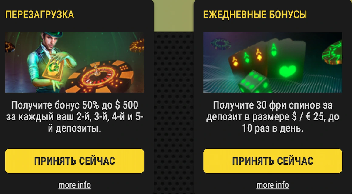 Бонусы выходных: 50 бесплатных вращений и 50% бонус до 500 евро, для получения которого необходимо сделать минимальный депозит 30 евро. Бонус доступен в субботу и воскресение 3 раза в день.